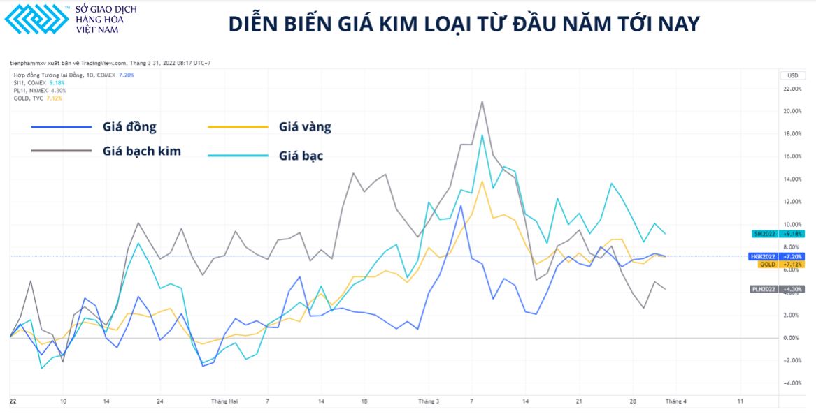 Từ đầu năm tới nay, giá đồng tăng 7,3% lên 10,473 USD/tấn, và hoàn toàn vượt trội so với một số mặt hàng kim loại khác như vàng hay bạch kim. Chỉ số MXV-Index Kim loại tăng 2% lên mức 2.224 điểm. Đây là chỉ số thể hiện sự biến động của các mặt hàng ở MXV đang được liên thông với thế giới gồm bạc, bạch kim, đồng, quặng sắt, nhôm, chì, thiếc, kẽm và niken.