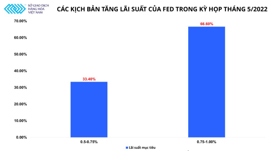 Trong tháng 3 vừa qua, Cục Dự trữ Liên bang Mỹ (Fed) đã tiến hành nâng lãi suất thêm 25 điểm cơ bản lần đầu tiên kể từ năm 2018, Ngân hàng Trung ương Anh (BOE) cũng tiến hành nâng lãi suất lần thứ 3 trong vòng 4 tháng lên 0,75%. Những động thái này đều cho thấy, các nhà hoạch định chính sách đang ưu tiên mục tiêu kiềm chế lạm phát. Công cụ theo dõi lãi suất, CME Watch Tool cho thấy có tới 66,6% khả năng Fed sẽ tăng lãi suất thêm 50 điểm cơ bản trong kỳ họp tháng 5 sắp tới, để đưa mức lãi suất điều hành lên 0,75% - 1,0%.