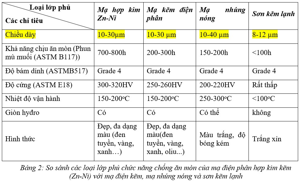 Một đặc tính tuyệt vời khác của lớp mạ hợp kim Zn-Ni là khả năng chịu nhiệt của nó. Lớp mạ này có thể chịu được nhiệt độ vượt quá 200oC trong 4h trong khi vẫn đạt được 800 giờ phun mù muối. Bảng 2 liệt kê các đặc tính của một vài lớp mạ kẽm từ các quy trình chế tạo khác nhau.