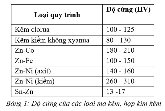 Độ cứng và khả năng chịu mài mòn của hợp kim Zn-Ni cao hơn 1,6 – 2 lần so với mạ kẽm thông thường, giúp nâng cao đáng kể tuổi thọ của các chi tiết. Độ cứng điển hình của một số loại quy trình kết tủa kẽm và hợp kim kẽm được liệt kê trong bảng 1.